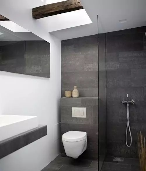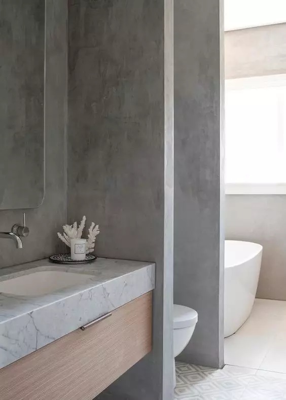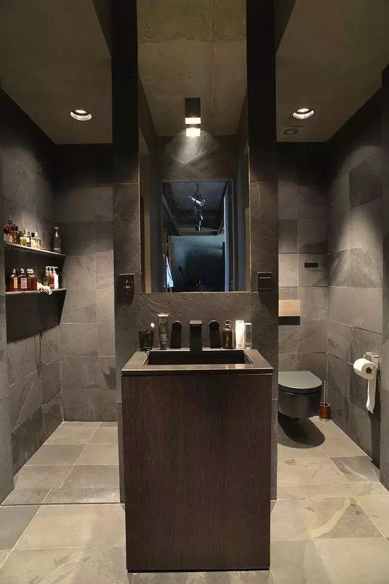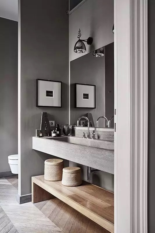 幹濕分離的主要手法,就是采用隔斷形式,將浴室與其他功能區分開。給洗浴留出了一定的位置後,其他空間全部交給馬桶和洗臉台。