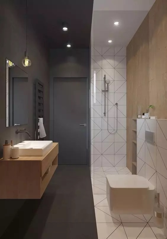 長方形格局可利用空間長度將坐便區、洗麵池、浴室並排設計,這樣布局的優勢在於形成一條流暢的動線,既有效解決了衛生間使用的尷尬局麵,又能營造出整潔清爽的視覺效果。