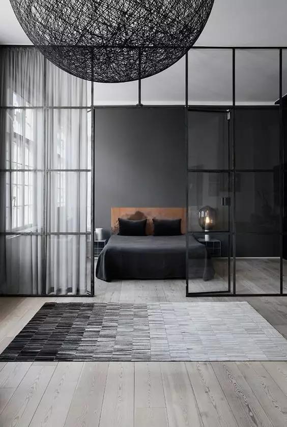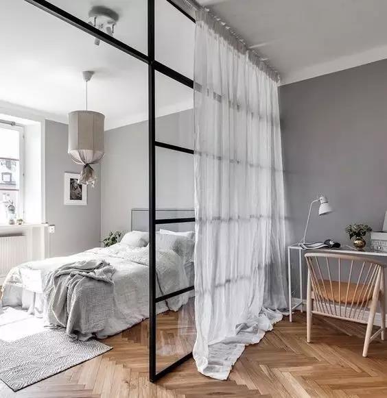 鈦鎂鋁金的隔斷門這兩年非常火,黑色的鋁金邊框加上通透的玻璃,很好的做了阻斷和通透空間的效果。用在臥室和客廳之間絕對不會出錯,如果覺得太亮,在臥亚洲国产成人精品无码区麻豆加一圈窗簾就可以很好的遮光啦!