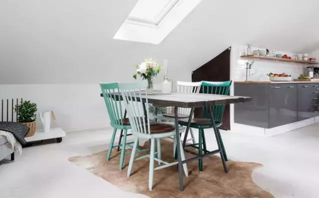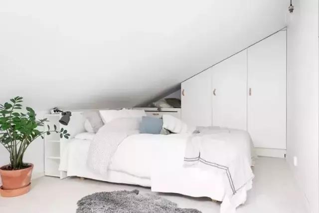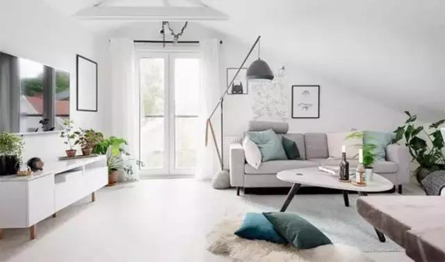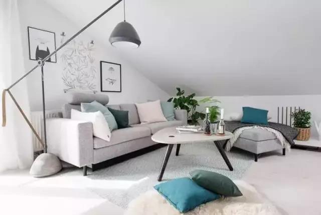 這是一套閣樓空間,這種空間的設計利用相對於正常的戶型來說更加複雜,因為屋頂有坡度,所以需要根據這個坡度來進行設計,選擇了很多低矮、簡單的家具,讓空間顯得不那麽有壓迫感,也使空間的使用達到了最大化。隨便擺放了很多綠植,與掛畫等進行搭配,形成標準的北歐風格。